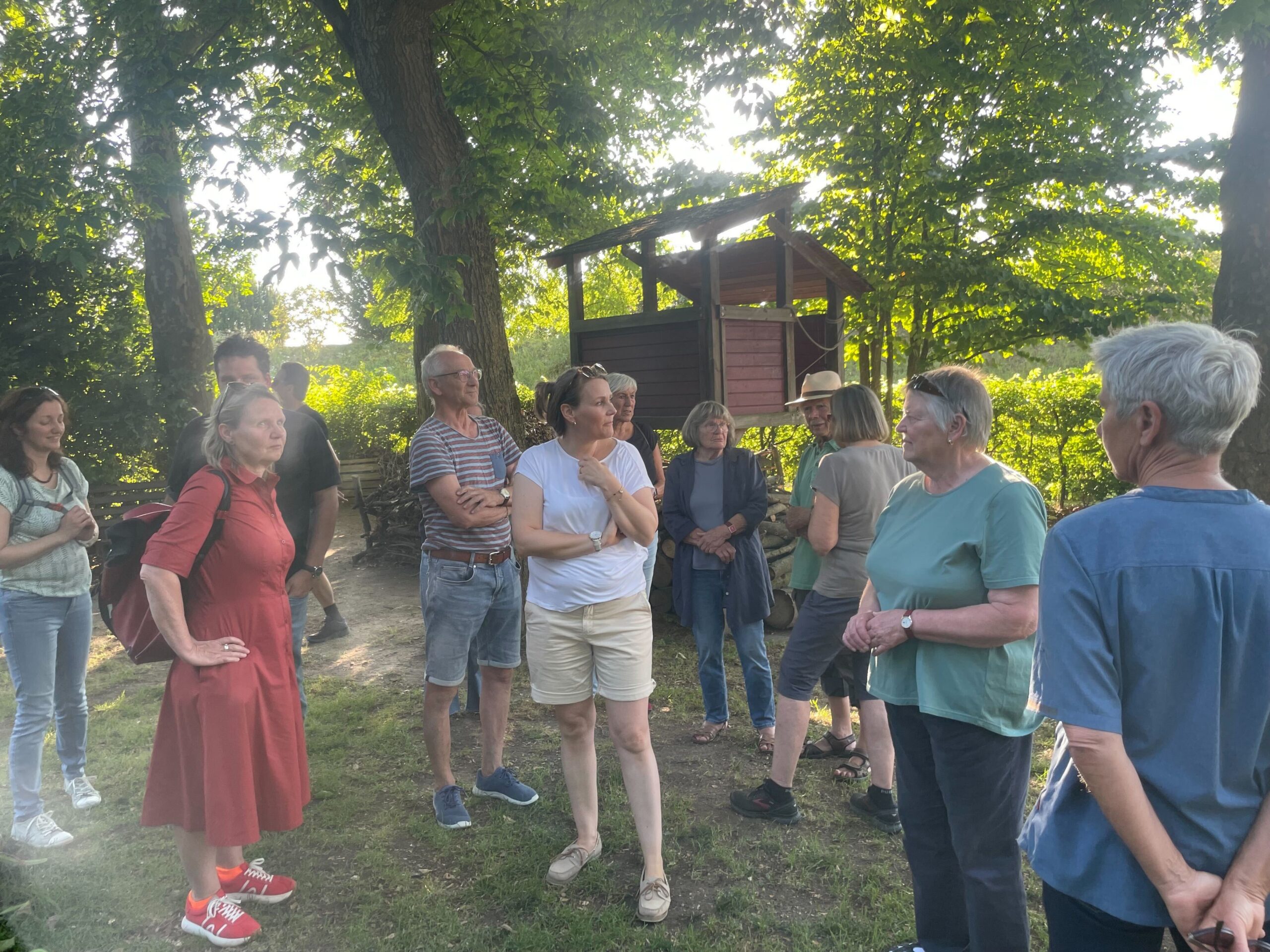 In der Tour ging es darum, Ideen zu vermitteln und sich darüber auszutauschen, was jede und jeder selbst tun kann. Auch ein kleiner Vorgarten lässt sich artenreich und insektenfreundlich bepflanzen. Manche Stauden wie Zypressenwolfsmilch, Goldhaarastern, Brandkraut oder Frauenmantel kommen mit Hitze und Trockenheit besser klar. Die Blüten von Wildstauden wie wilder Möhre, Wiesensalbei, Labkraut und Natternkopf sind für viele Insekten überlebenswichtig. Der Blick hinter die Gartentüren zeigte, wie unterschiedlich die jeweiligen Besitzerinnen und Besitzer ihre Gärten angelegt haben. Wer hätte schon mitten in Lichtenau einen Waldgarten vermutet. Auch ein Klimawandelanpassungsbeet regte zum Nachdenken an. Auffällig in allen Gärten waren Wasserläufe, Teiche und kleine Wasserbecken, genauso wie alte Baumstämme, große Wurzeln und Holzstapel. Insekten sind auch darauf angewiesen.