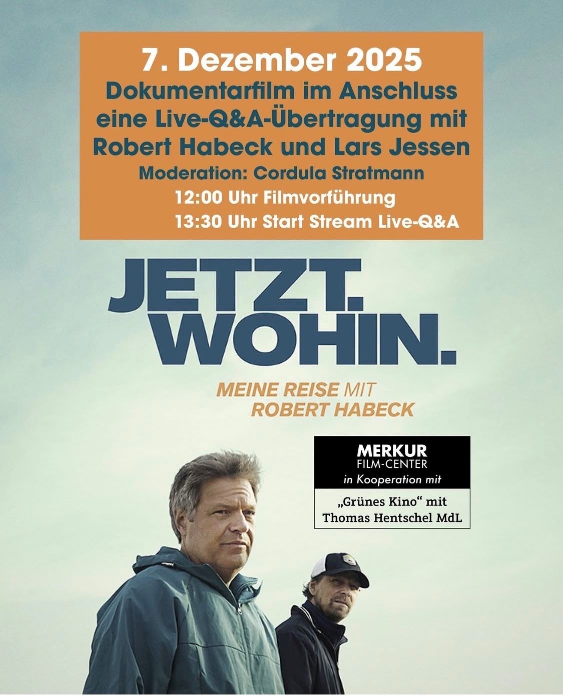 „Jetzt.Wohin.“ist ein sehr persönlicher Dokumentarfilm von Lars Jessen. Der Film blickthinter die Kulissen des Wahlkampfs 2025 von Robert Habeck – einer Kampagne, diemit großen Erwartungen beginnt und mit deutlichen Einbußen für die GRÜNENendet. Danach zieht sich Habeck aus der Politik zurück. Kaum ein deutscherPolitiker hat in den letzten Jahren stärker polarisiert: Für die einen ist erHoffnungsträger, für die anderen Projektionsfläche aller Enttäuschungen. LarsJessen – Filmemacher, Freund, Berater und langjähriger Weggefährte – suchtAntworten: Warum ist es so gekommen? Was ist schiefgelaufen und wie kannprogressive Politik in Zeiten von Populismus wieder gelingen? Auf seiner Suchespricht Jessen mit Weggefährt*innen aus allen Phasen von Habecks Leben: ausPolitik, Schulzeit, sowie mit Neuro- und Kommunikationswissenschaftler*innen,Denker*innen, Erzähler*innen, Schauspieler*innen Moderatoren undJournalist*innen.